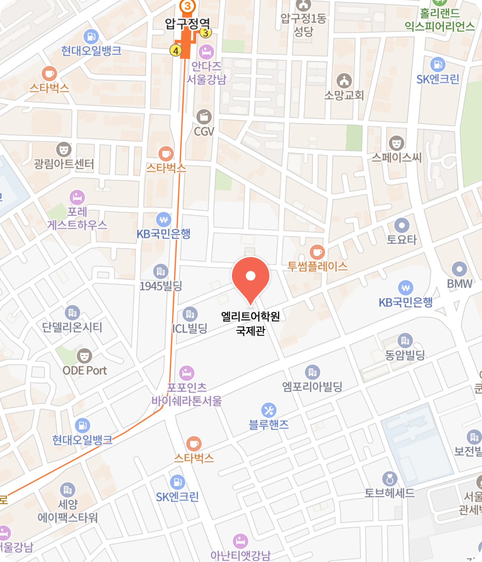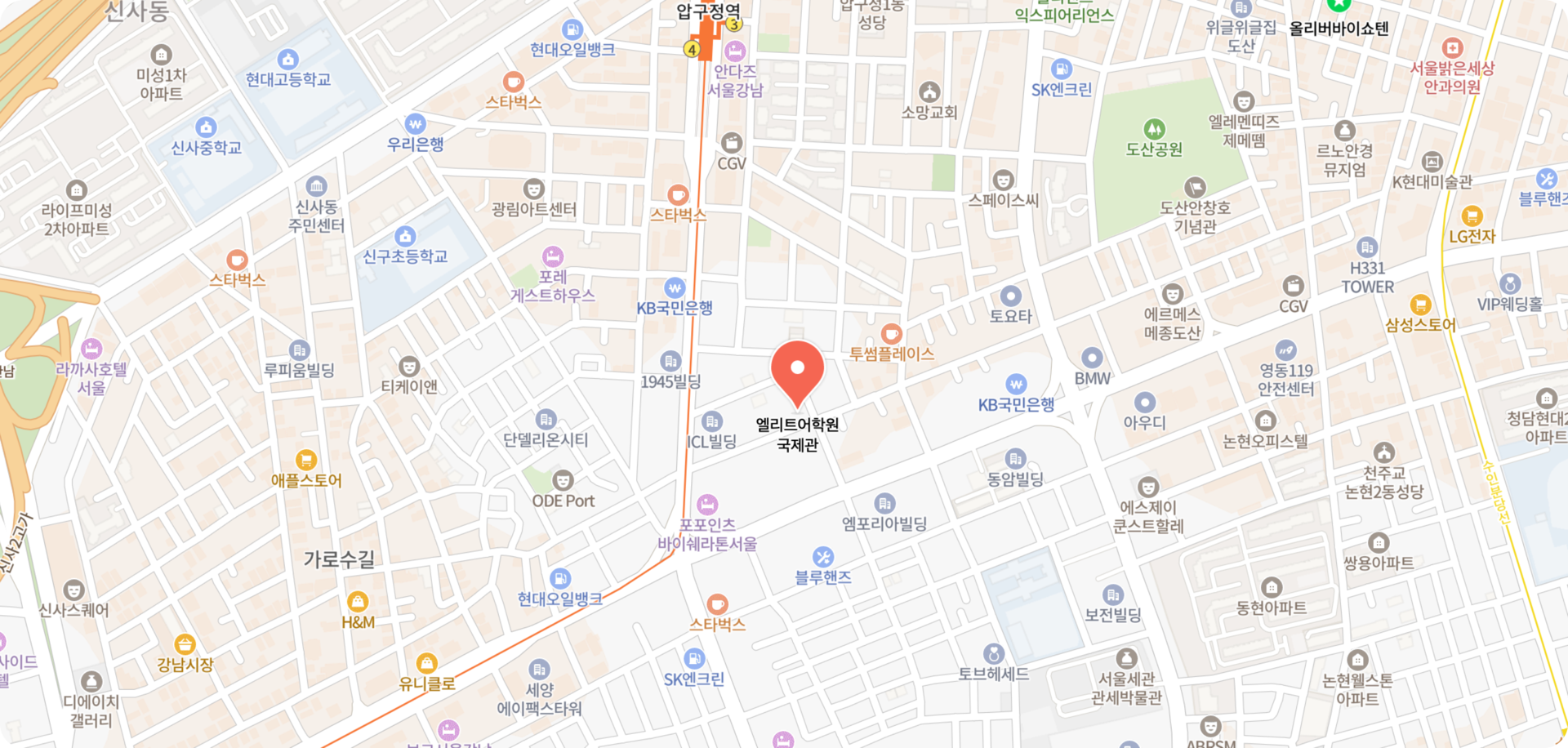 엘리트어학원 압구정 본관 주소 : 서울 강남구 논현로168길 36, 안국빌딩 5층지하철 : 3호선 압구정역 3번 출구 → 도보 약 6분버스 : 141번(파랑), 3011번(녹색) → 신구중학교 정류장 하차